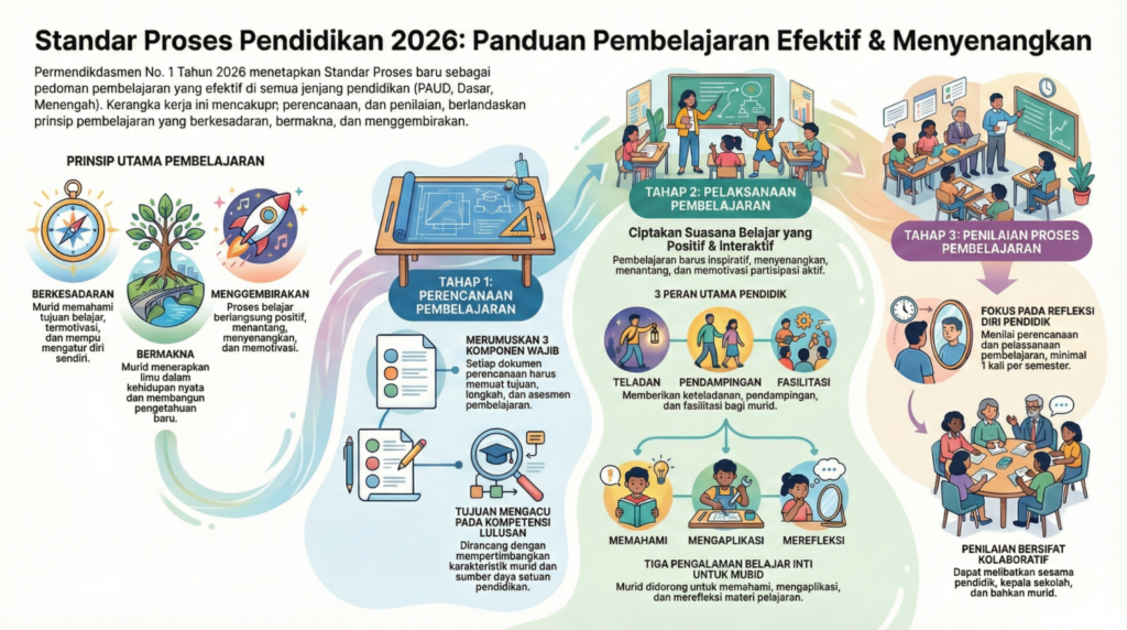 Pemerintah melalui Kementerian Pendidikan Dasar dan Menengah baru saja menetapkan Permendikdasmen Nomor 1 Tahun 2026 tentang Standar Proses pada PAUD, Jenjang Pendidikan Dasar, dan Menengah. Peraturan ini hadir untuk menggantikan standar sebelumnya (Permendikbudristek No. 16 Tahun 2022) agar lebih relevan dengan perkembangan ilmu pengetahuan, teknologi, dan dinamika sosial saat ini.